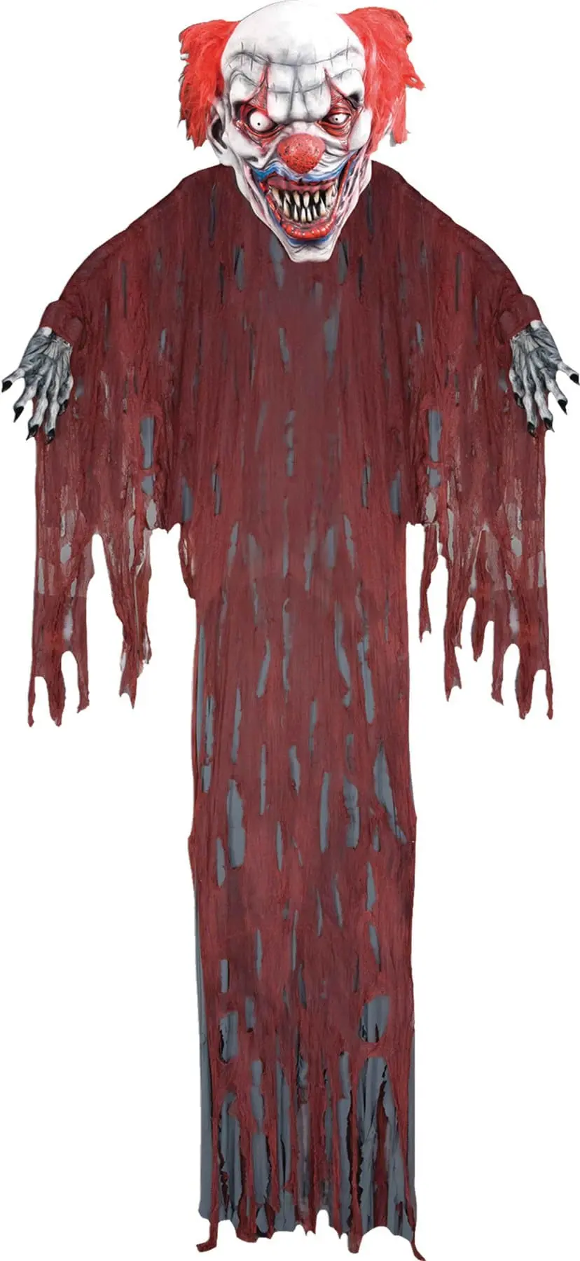 12′ Tall Hanging Evil Clown- With a large, deranged clown face that features classic makeup, red nose, and bright orange hair, he’s truly a ghastly sight to behold. Boney skeleton hands stretch out to his sides, while a long tattered red gauze robe makes him look large and menacing.
