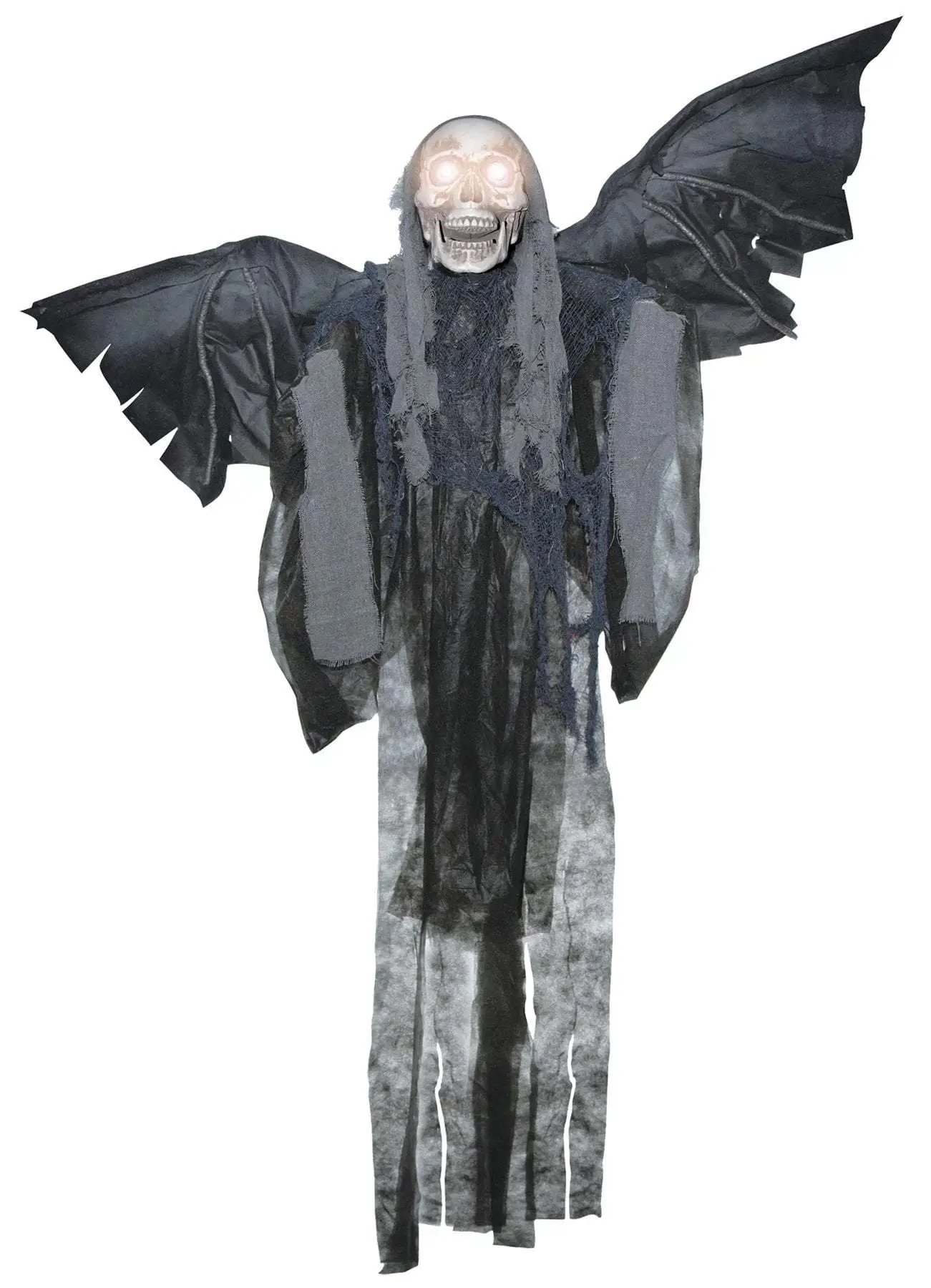 Animated Flying Reaper- Plastic skeletal parts(arms are posable) with rotted, shredded look rags attached with large spread posable wings that move up and as though they were flapping, makes scary sounds and light up eyes. 38 inches tall and 52 inch wing span. Requires 3 AA batteries, not included.